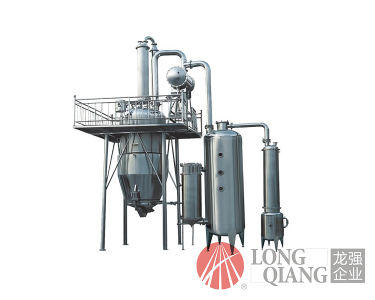 将药材投入提取罐内,加药材的5~10倍的溶剂如水、乙醇、甲醇、丙酮等(据工艺要求)。开启提取罐直通和夹套蒸汽阀门,使提取液加热至沸腾20-30分钟后,用抽滤管将1/3提取液抽入浓缩器。关闭提取罐直通和夹套蒸汽、开启加热器阀门使液料进行浓缩。浓缩时产生二次蒸汽,通过蒸发器上升送人提取罐作提取的热源和溶液,维持提取内沸腾。